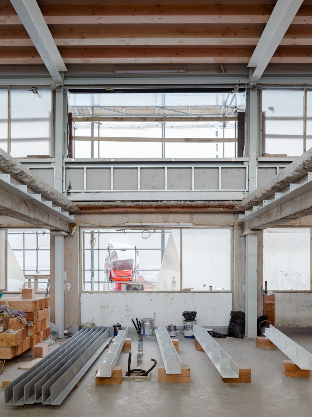Im Inneren ist der Arbeitsbereich offen und lichtdurchflutet, mit sichtbarem verzinktem Stahl und Douglasienholz, das das industrielle Erbe des Gebäudes würdigt und gleichzeitig eine zeitgemäße Atmosphäre schafft.