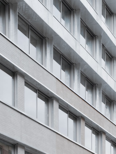 Die Wahl von feuerverzinktem Stahl als Verkleidung ist sowohl praktisch als auch künstlerisch. Durch sorgfältige Forschung und Prototypenentwicklung wurden die Stahlplatten hinsichtlich ihrer Haltbarkeit und skulpturalen Qualität optimiert. Das Material, das anfangs hell und reflektierend ist, altert auf elegante Weise, wird weicher und passt sich so harmonisch in die städtische Landschaft ein.