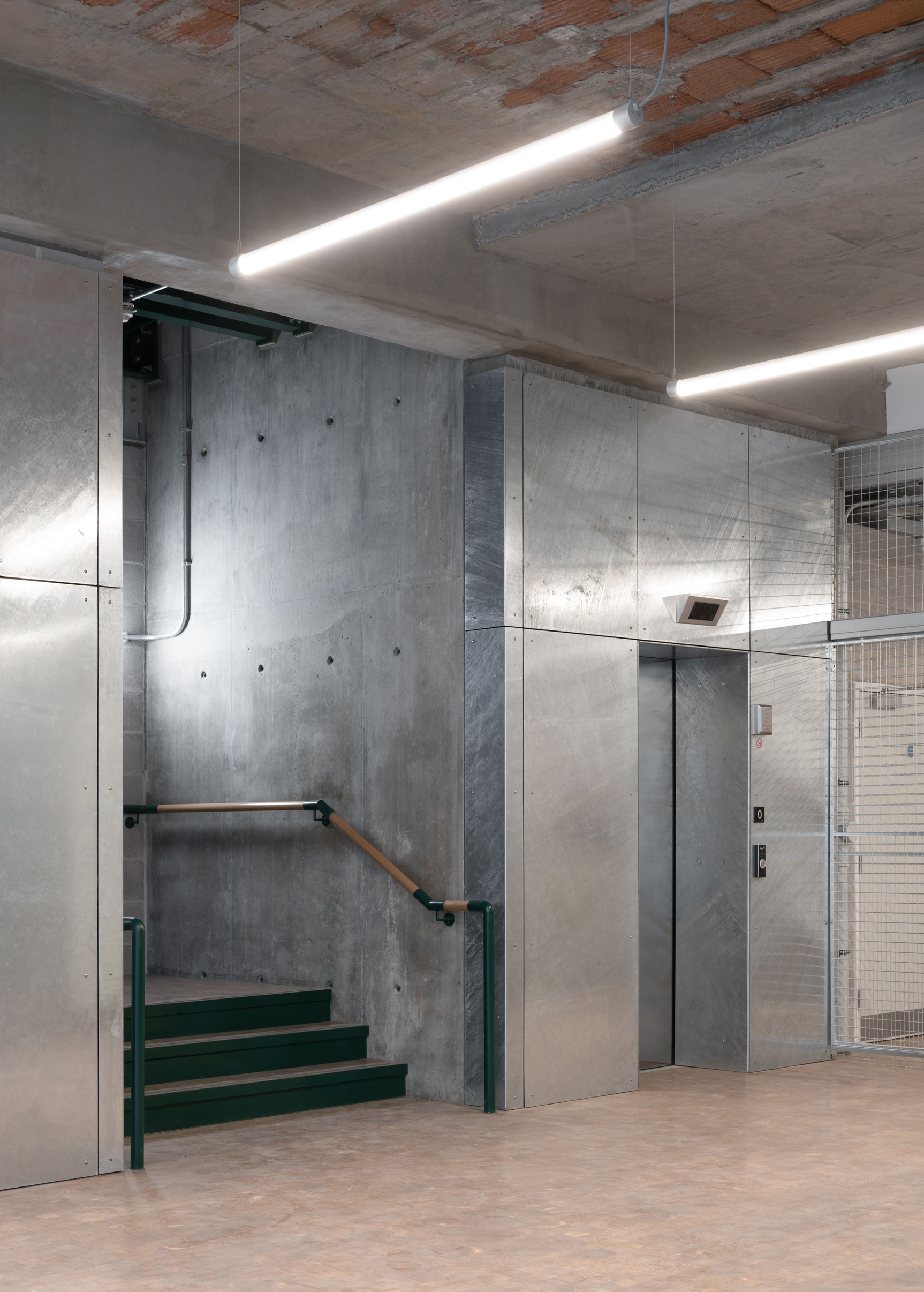 Die 2.200 m² großen Räumlichkeiten bieten nun einen kreativen und flexiblen Arbeitsbereich, der sich durch viel Tageslicht und eine robuste Materialpalette auszeichnet. Die Einführung einer eleganten, feuerverzinkten Stahlfassade aus 3 mm starkem Stahlblech mit präzisen Details verleiht dem Gebäude eine zusätzliche architektonische Raffinesse. Die tiefen Laibungen und horizontalen Lamellen sorgen für einen effektiven Sonnenschutz und zahlen auf Energieeffizienz sowie auf die Gesamtästhetik ein.