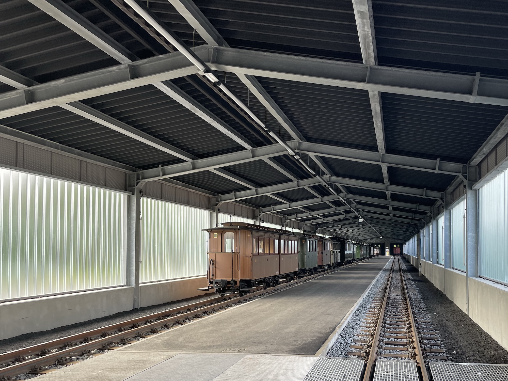 Die Verzinkung bleibt dabei sichtbar und verleiht dem Tragwerk eine klare, materialechte Visualität. Schutzwirkung und architektonischer Ausdruck stehen im Einklang. Transluzente Profilglasflächen und Streckmetallelemente modulieren Licht und Transparenz. Die Halle bleibt offen genug, um den Betrieb erlebbar zu machen, und geschlossen genug, um den historischen Fahrzeugbestand zu schützen.