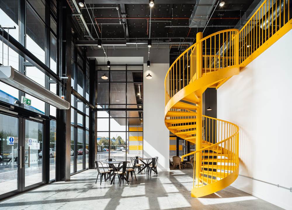 Anstatt sich auszubreiten, ragt Industria in die Höhe. Das Projekt umfasst 11.500 m² flexible Industriefläche, verteilt auf 45 KMU- und Flachfabriken, die über drei Etagen verteilt sind. Entscheidend ist, dass eine spiralförmige Laderampe den direkten Zugang für Fahrzeuge zu den oberen Etagen ermöglicht, sodass Unternehmen unmittelbar vor ihren Toren laden und warten können.
