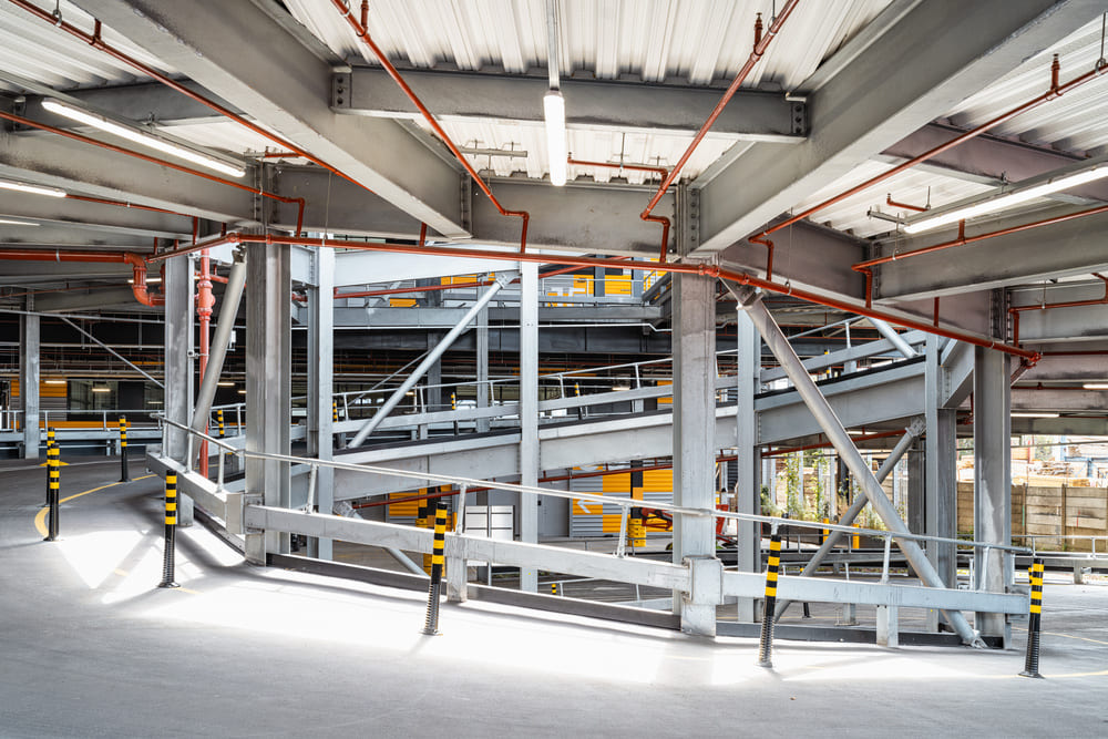 Aus Sicht eines Verzinkers wird das Projekt an dieser Stelle besonders interessant. Feuerverzinkter Stahl wird nicht versteckt, sondern bildet das sichtbare, ausdrucksstarke Gerüst des Gebäudes. Die freiliegende Rampenstruktur – Säulen und Träger –, Außentreppen, Handläufe, grüne Wandgitter und Stützrahmen sind verzinkt, zum Schutz und zur Bildung eines visuellen Ankers.